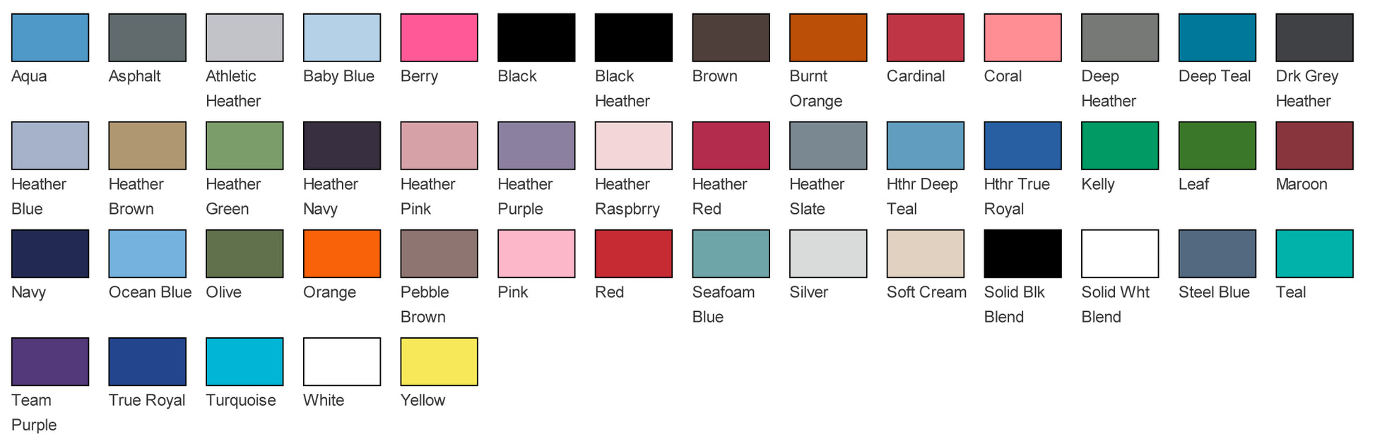 - all other Heather/Blend colors are 52% combed ringspun cotton, 48% polyester