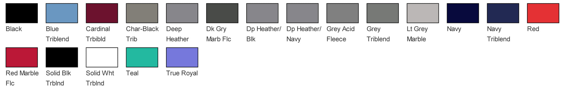 - Solids & Colorblocks – 60/40 combed and ringspun cotton/poly, 30 singles, 6.5 oz
